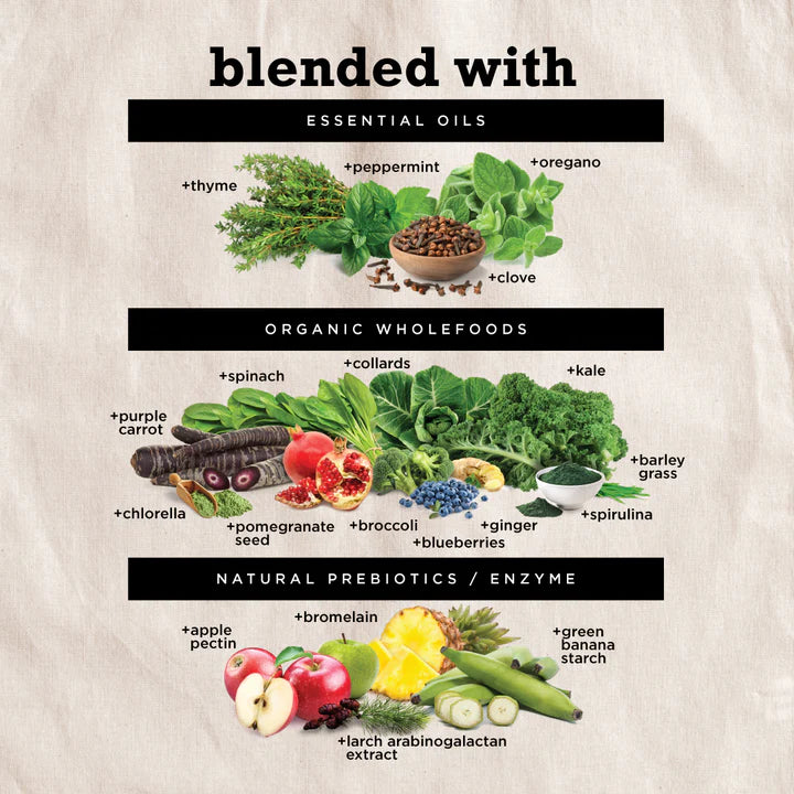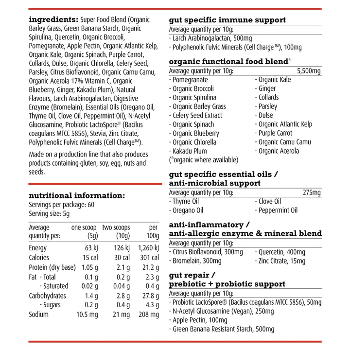 We have included a world first blend of Anti parasitic essential oils, and gut specific raw organic wholefoods to improve gut health and increase nutrient absorption while decreasing bloating.