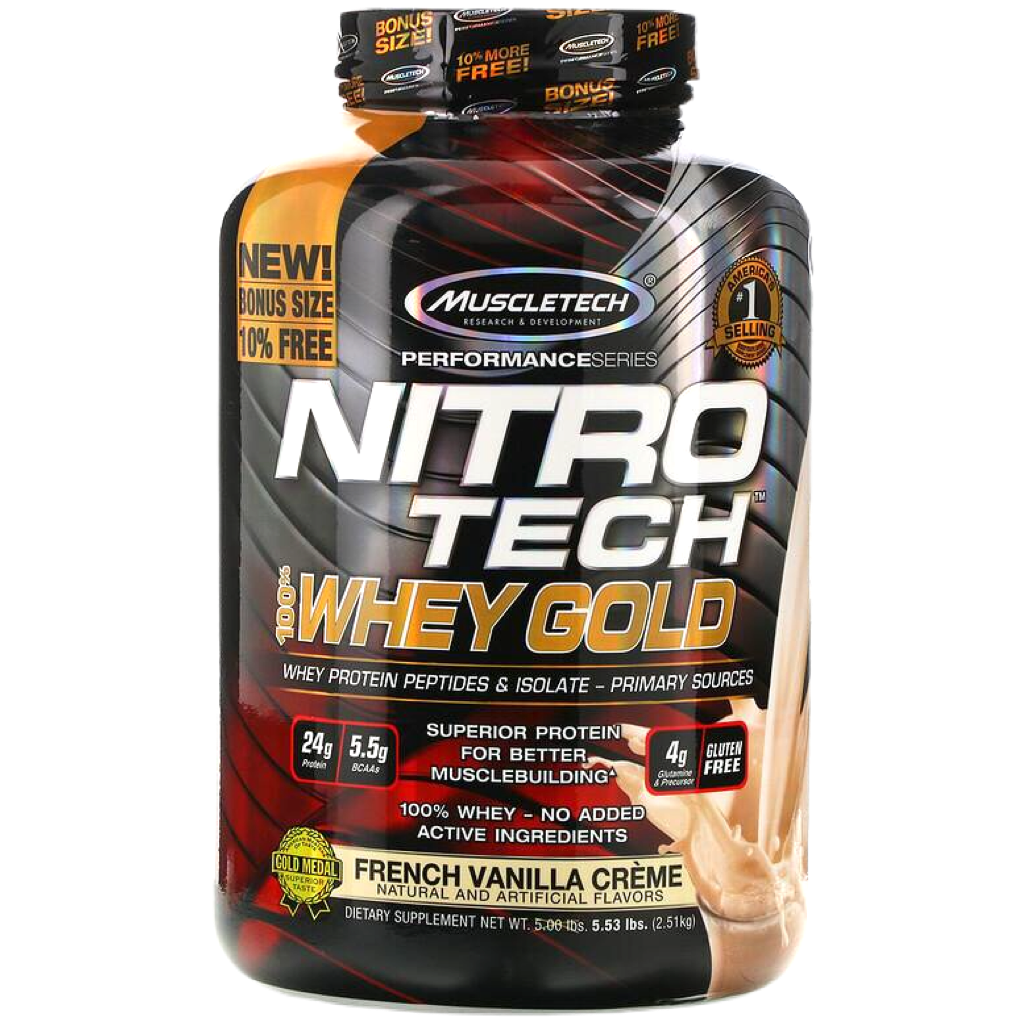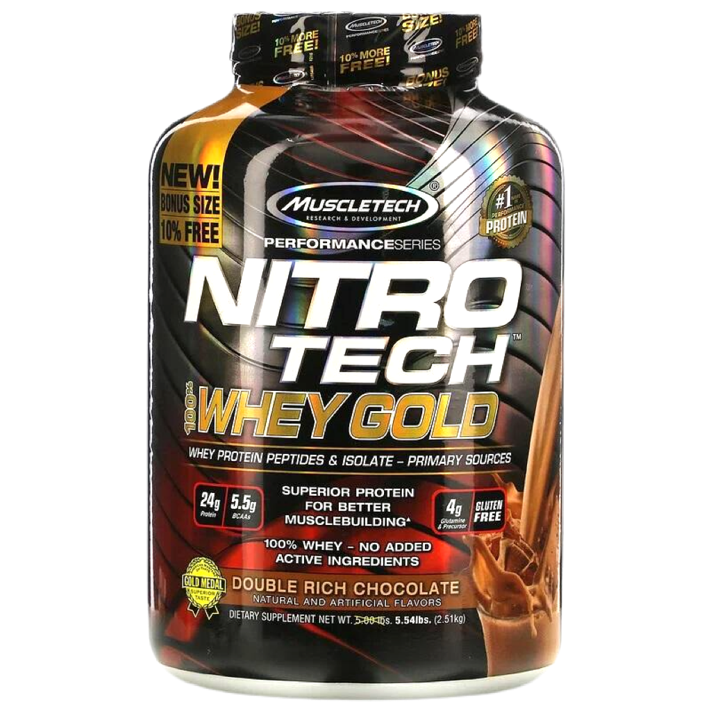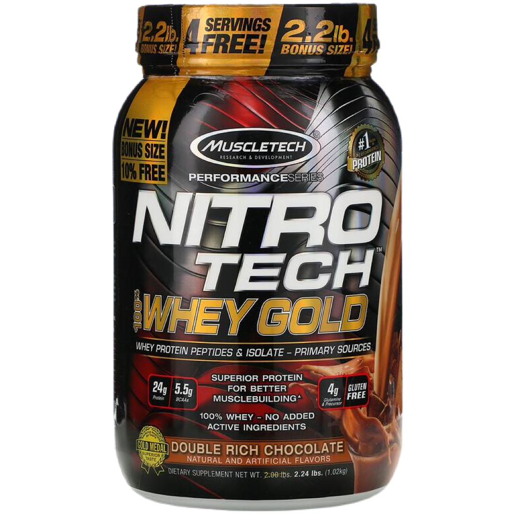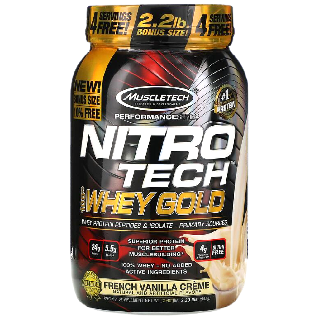 Superior Science. Superior Results.Hydrolyzed whey peptides are the fastest-absorbing protein micro-fractions on the planet, which is why they are a significant part of our formula! Along with micro-filtered whey protein isolate plus whey concentrate, Nitro-Tech® 100% Whey Gold delivers superior absorption, digestibility and mix-ability. Each scoop serves up 24 g of ultra-premium protein that supplies 5.5 g of BCAA and 4 g of glutamine and precursor. Nitro-Tech 100% Whey Gold uses a superior cold microfiltration process to guarantee a higher quality whey protein. Combined with an award-winning flavor profile, Nitro-Tech 100% Whey Gold is as good for your taste buds as it for your muscles!