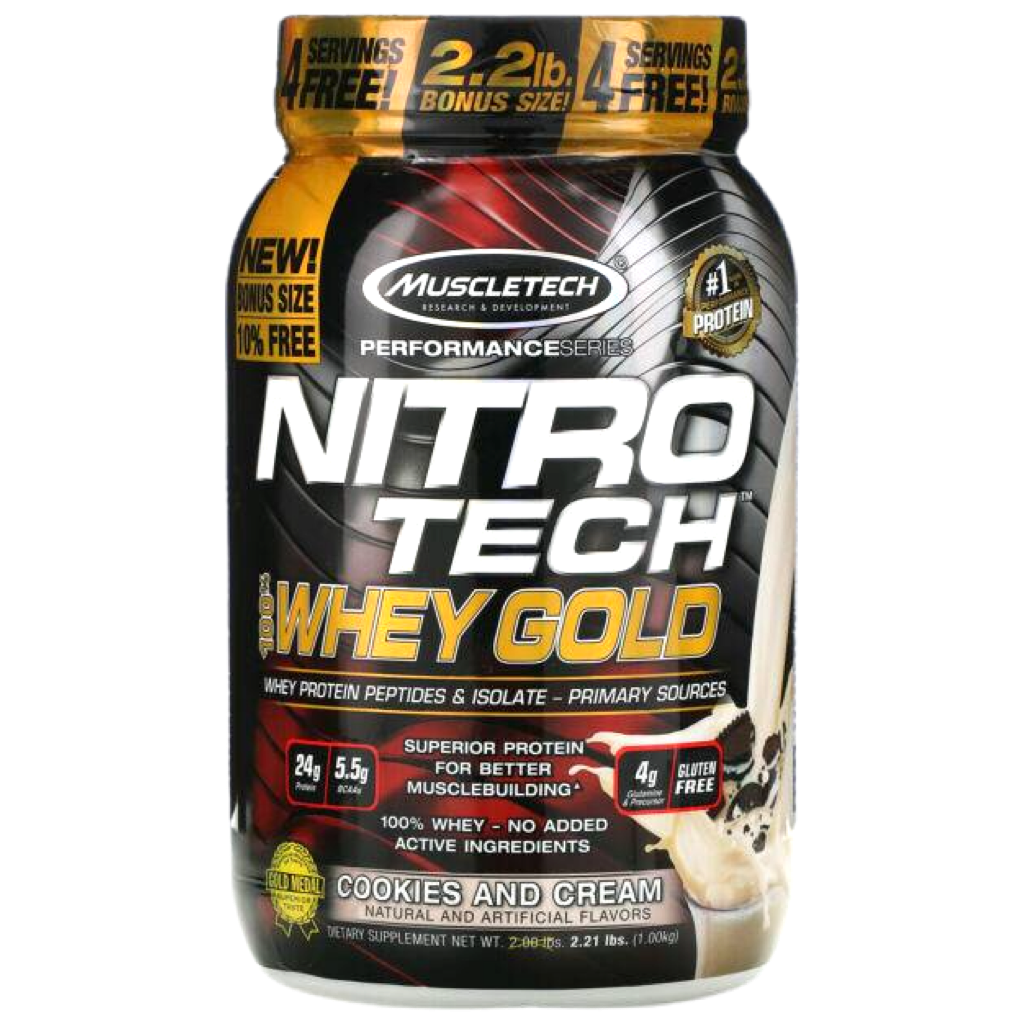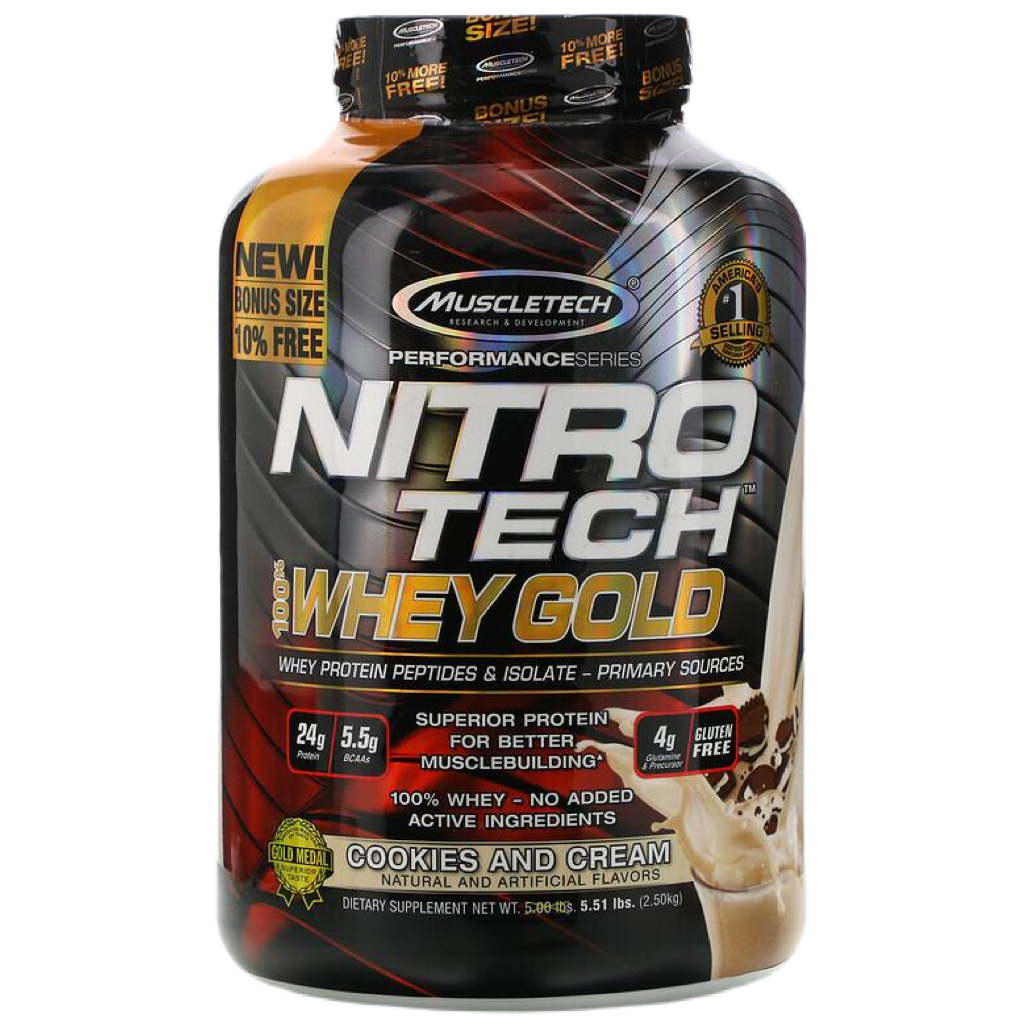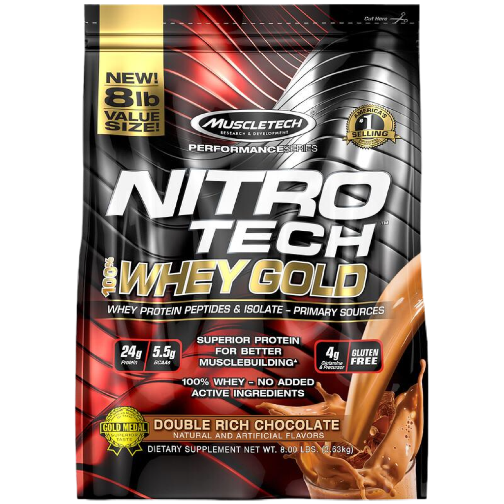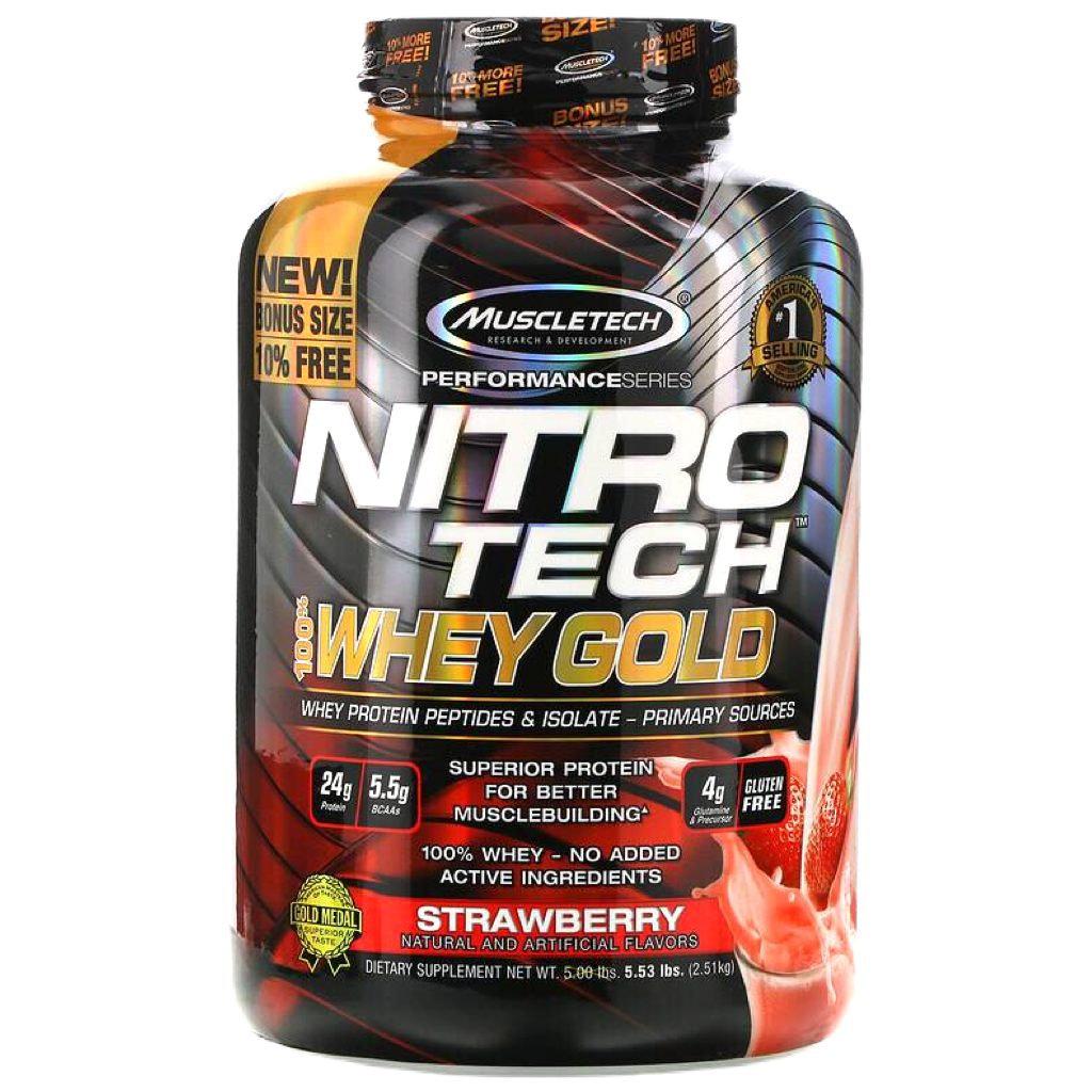 Superior Science. Superior Results.Hydrolyzed whey peptides are the fastest-absorbing protein micro-fractions on the planet, which is why they are a significant part of our formula! Along with micro-filtered whey protein isolate plus whey concentrate, Nitro-Tech® 100% Whey Gold delivers superior absorption, digestibility and mix-ability. Each scoop serves up 24 g of ultra-premium protein that supplies 5.5 g of BCAA and 4 g of glutamine and precursor. Nitro-Tech 100% Whey Gold uses a superior cold microfiltration process to guarantee a higher quality whey protein. Combined with an award-winning flavor profile, Nitro-Tech 100% Whey Gold is as good for your taste buds as it for your muscles!