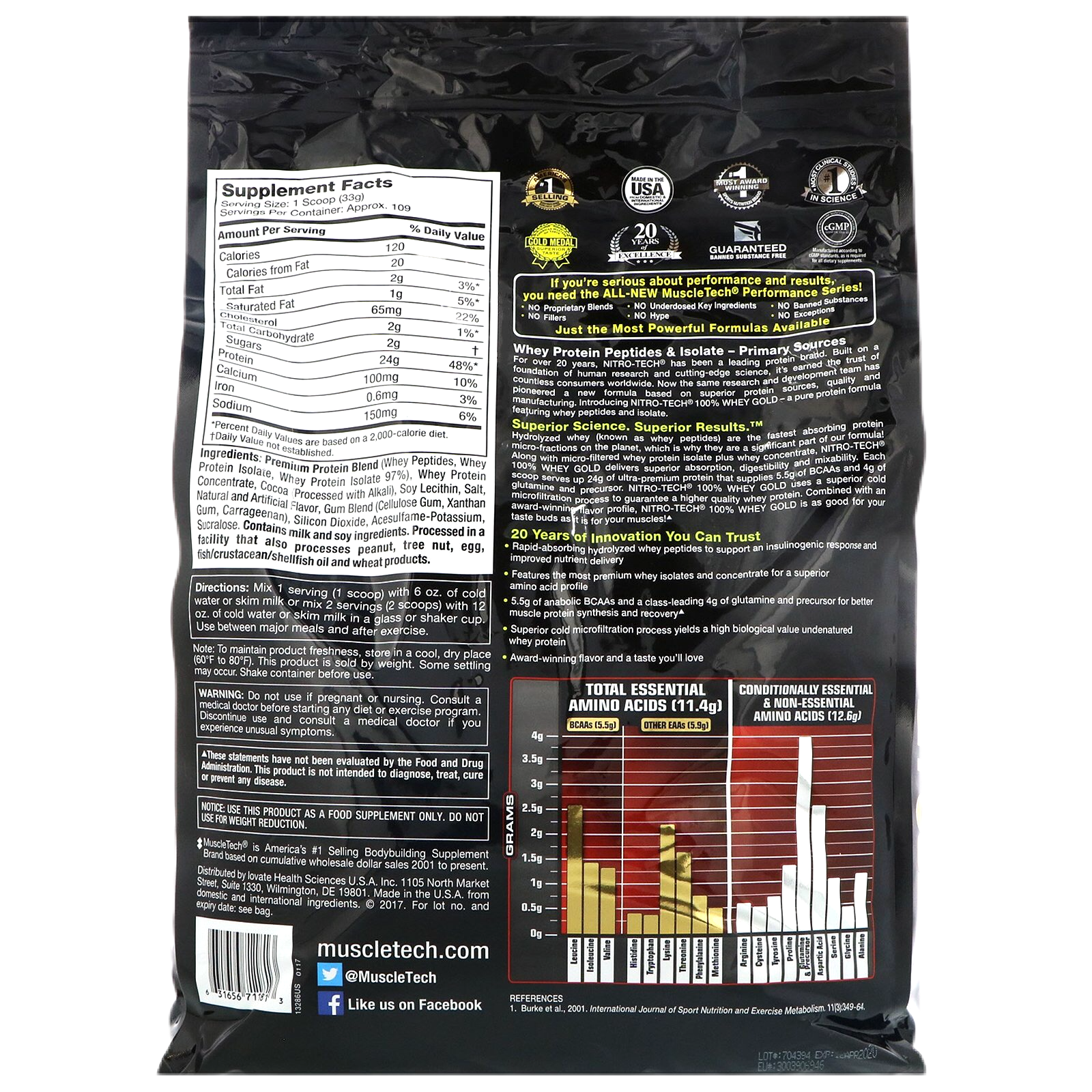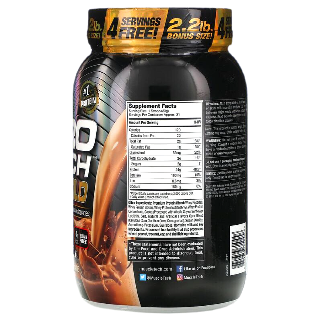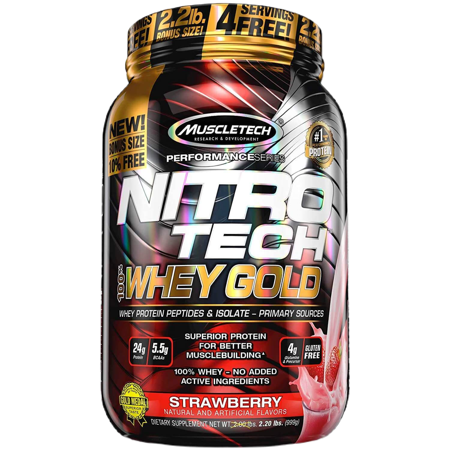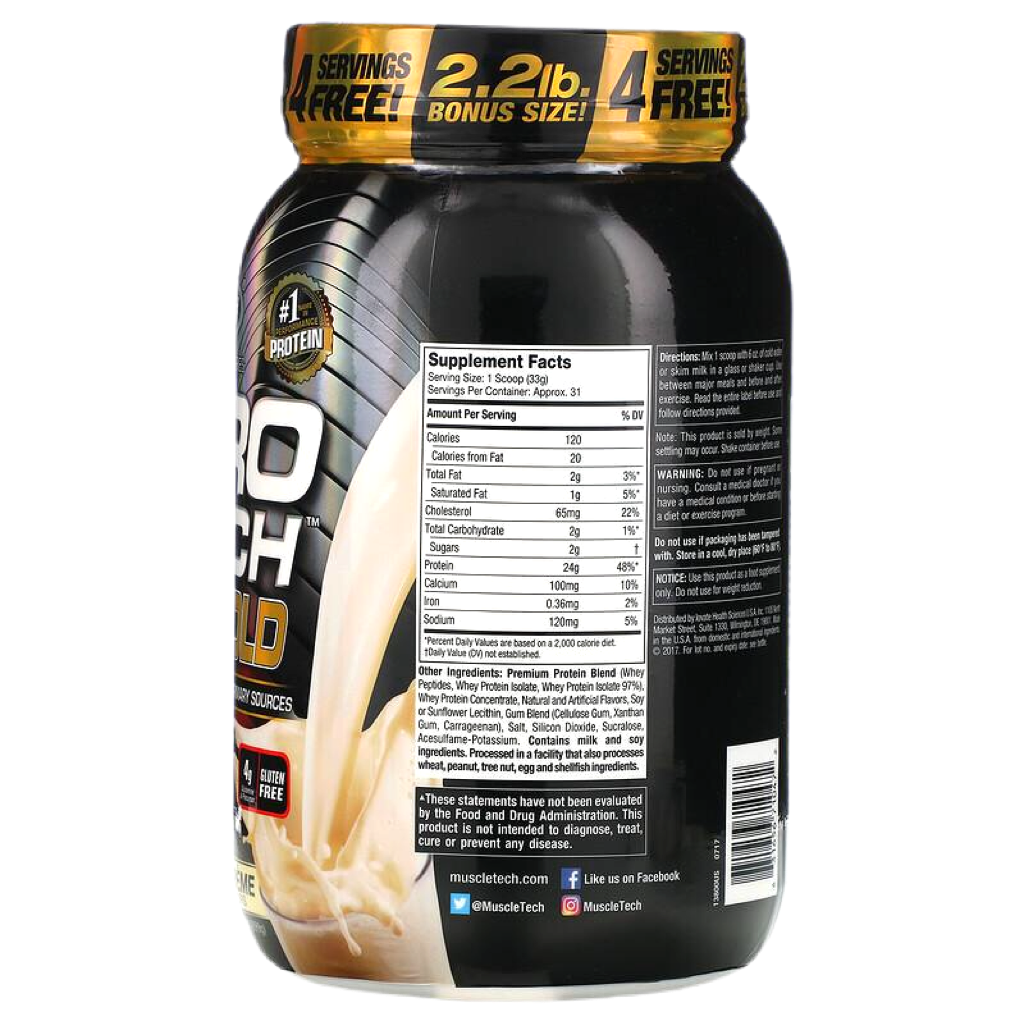 Superior Science. Superior Results.Hydrolyzed whey peptides are the fastest-absorbing protein micro-fractions on the planet, which is why they are a significant part of our formula! Along with micro-filtered whey protein isolate plus whey concentrate, Nitro-Tech® 100% Whey Gold delivers superior absorption, digestibility and mix-ability. Each scoop serves up 24 g of ultra-premium protein that supplies 5.5 g of BCAA and 4 g of glutamine and precursor. Nitro-Tech 100% Whey Gold uses a superior cold microfiltration process to guarantee a higher quality whey protein. Combined with an award-winning flavor profile, Nitro-Tech 100% Whey Gold is as good for your taste buds as it for your muscles!
