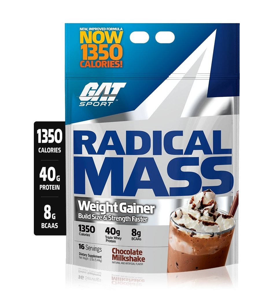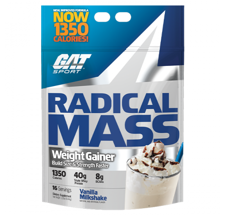 GAT RADICAL MASS is a premium weight gainer delivering a HUGE 1350 calories* and only 6 grams of fat per serving without sacrificing a deliciously rich milkshake flavor. Fortified with key nutrients and electrolytes in a 3:1 carb-to-protein ratio providing 50 grams of high-quality proteins from our own Triple-Whey Matrix.